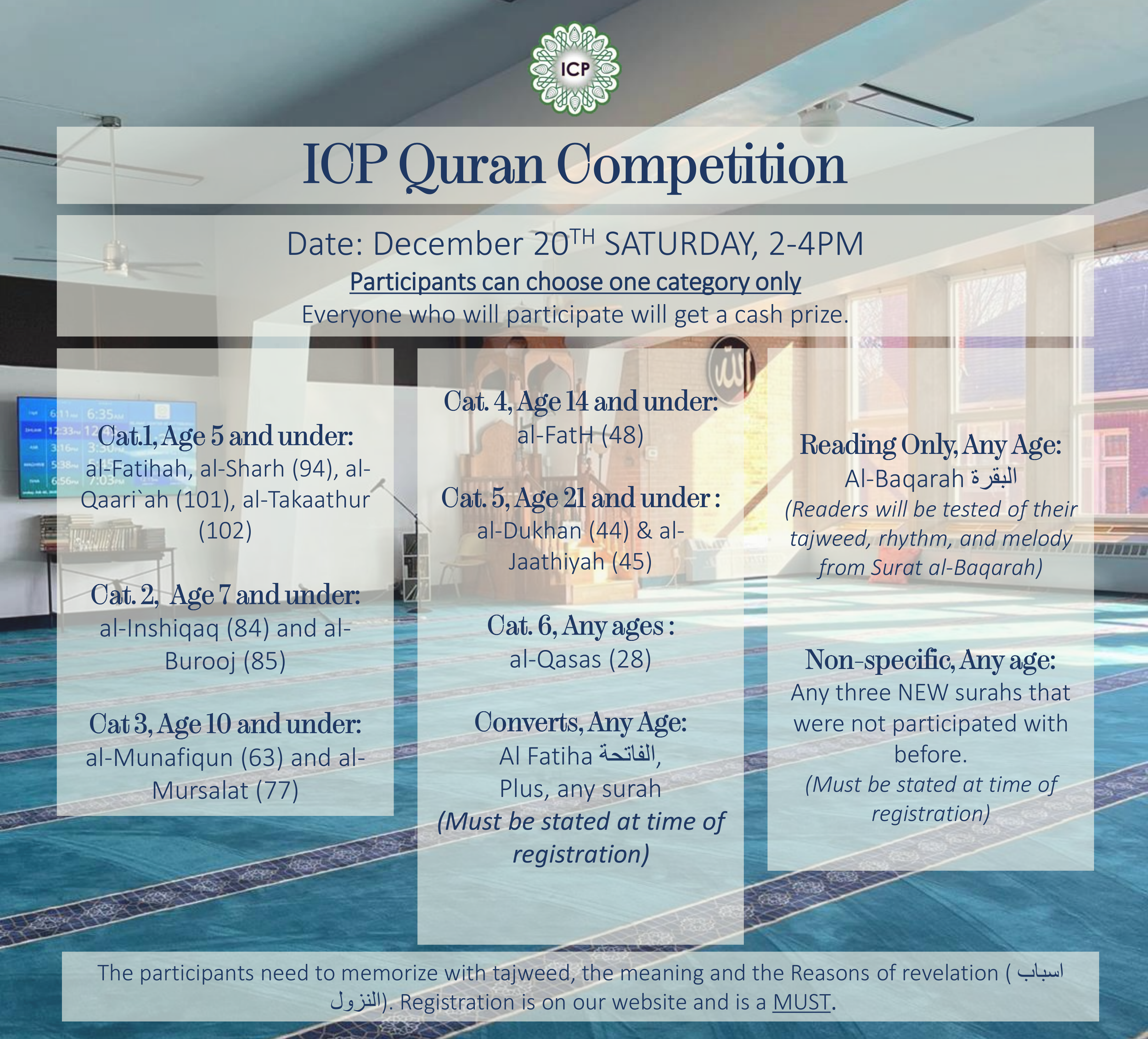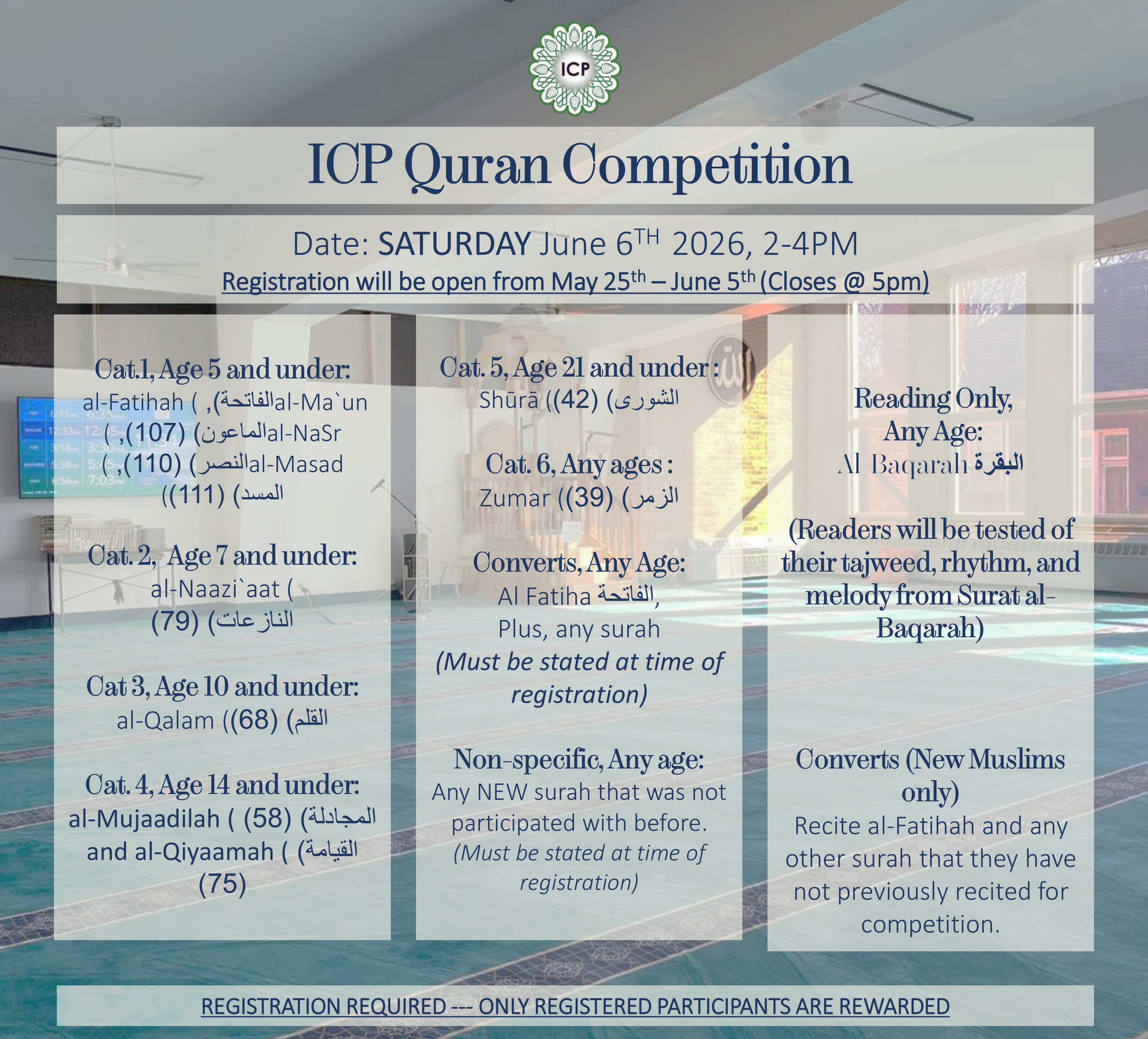 The ICP board and treasury supports these competitions with generous cash prizes for all participants. The ICP religious director or imam offers an inspiration word at the beginning of each event and reads the list of winners at the end. The event is primarily organized by dedicated volunteers, teachers, current and former board members, staff, etc. Judges are handpicked volunteers from the community. No Muslim in Pittsburgh is barred from applying, participating, and being rewarded, even if they are from the ICP board, staff, volunteers, or competition judges, or their families, or non-members. Judges are to be trusted for impartiality. Everyone is limited to one single category of participation.