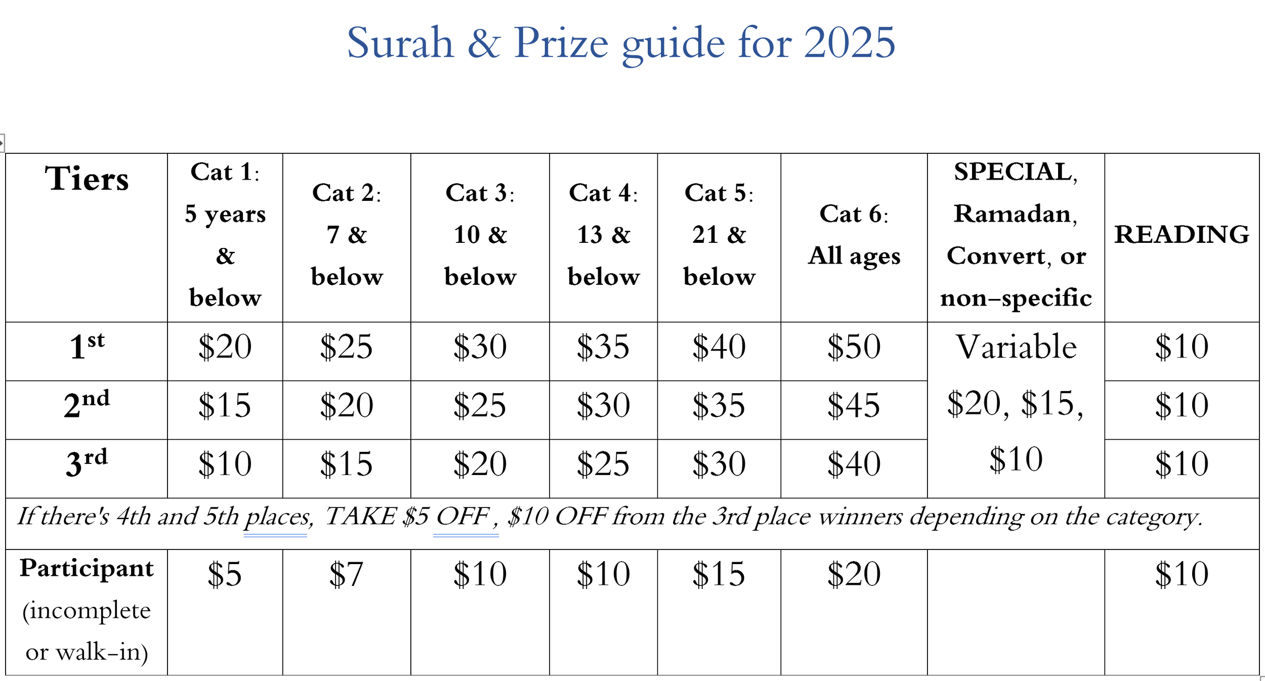 Surahs and categories are chosen with gradually increasing the amount to memorize based on age. The youngest will memorize approximately one page from the last surahs of the Quran. The next youngest (category 2) will memorize approximately 1.5 pages from the rest of juz' `Amma. If a participant joins us for every quarter for all the years they are eligible, they should have juz amma completely memorized by the time they age out.