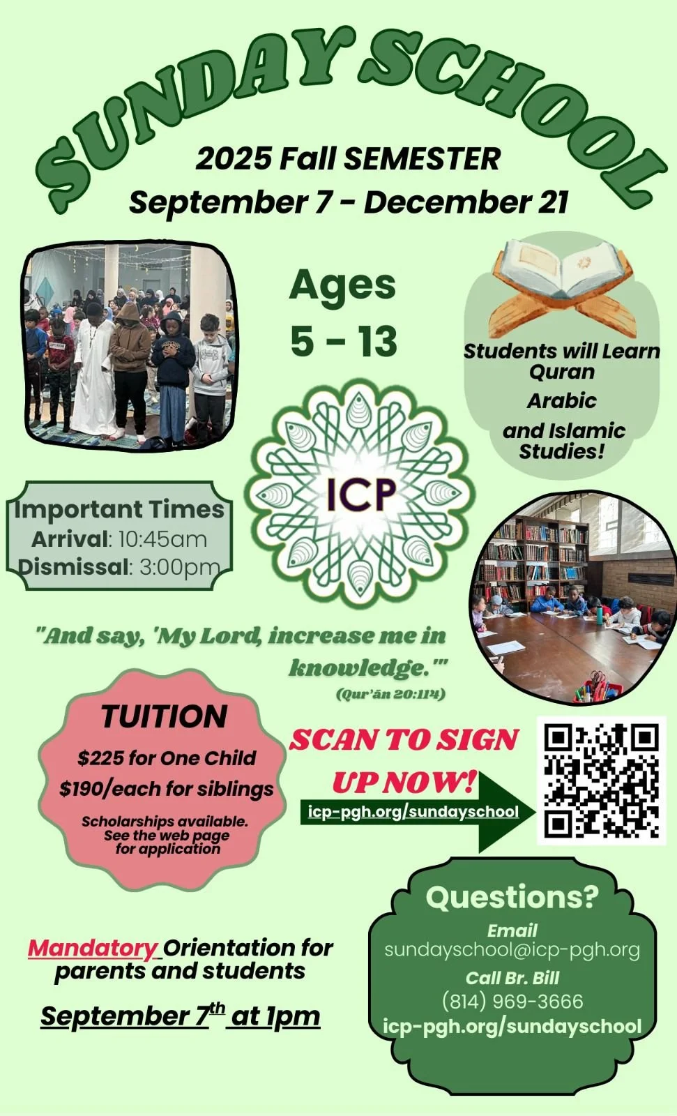 At the Islamic Center of Pittsburgh, we feel it is important for our children to develop a love for Islam and the masjid at an early age. Our Sunday School places a strong emphasis on balancing a strong foundation in Islamic knowledge with activities that will keep students excited to come to school week after week. Furthermore, we are committed to bringing out the best in every student through the high moral standards and teachings of the Qur’an and Sunnah.
