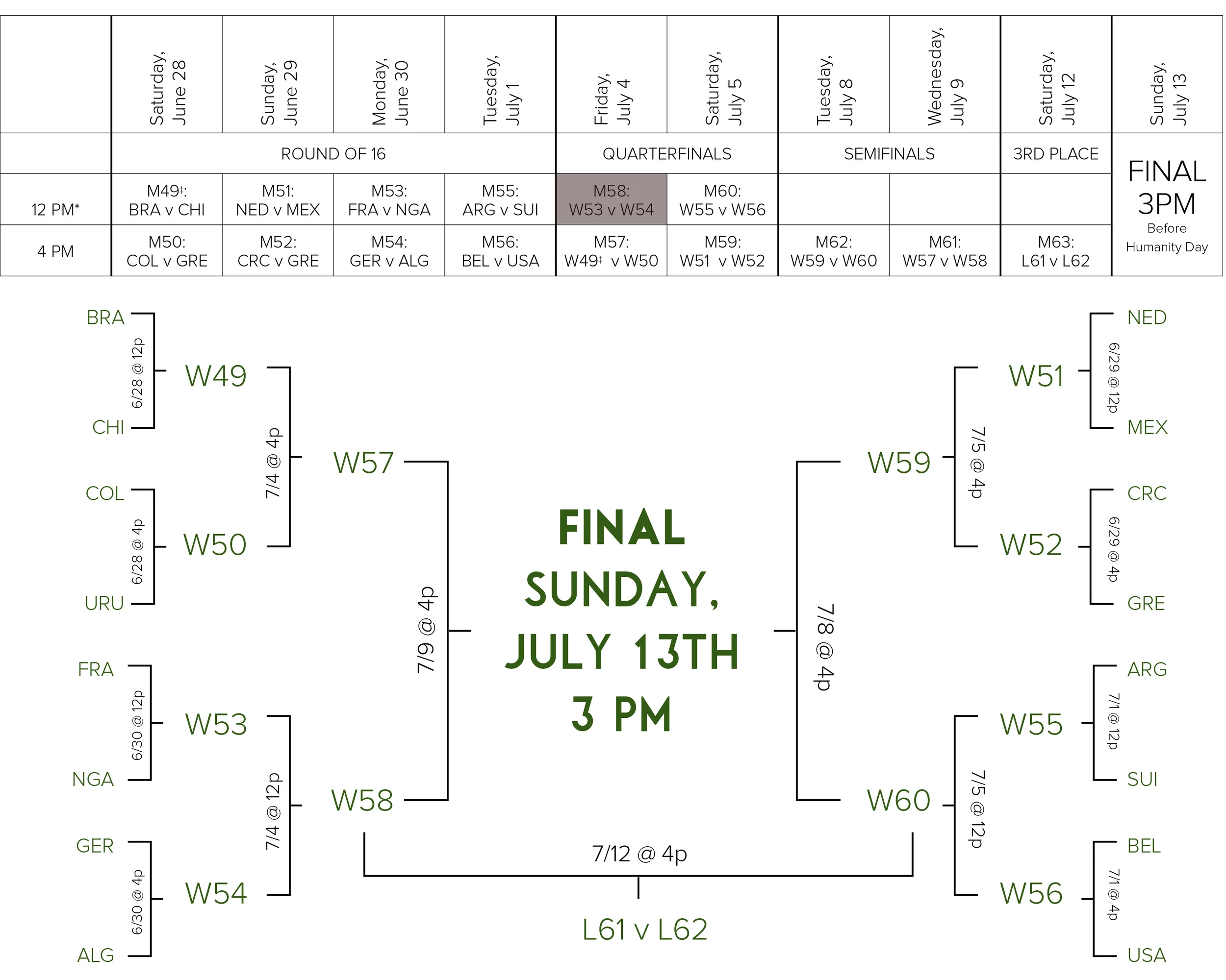 Below is the schedule for the Group Stage matches. Grayed-out games will not be aired at the ICP due to scheduling conflicts. All times are local (EST). We have the Islamic environment, the big screen TV, the snacks, the vibrant outbursts of support from all of our diverse nationalities, and of course, the banter. What better way to watch the World Cup than with the ICP?